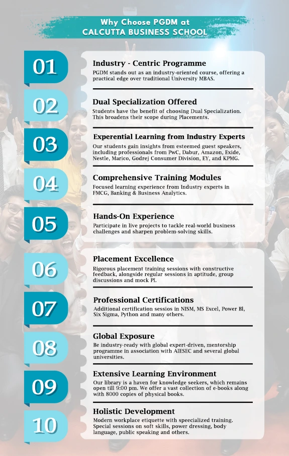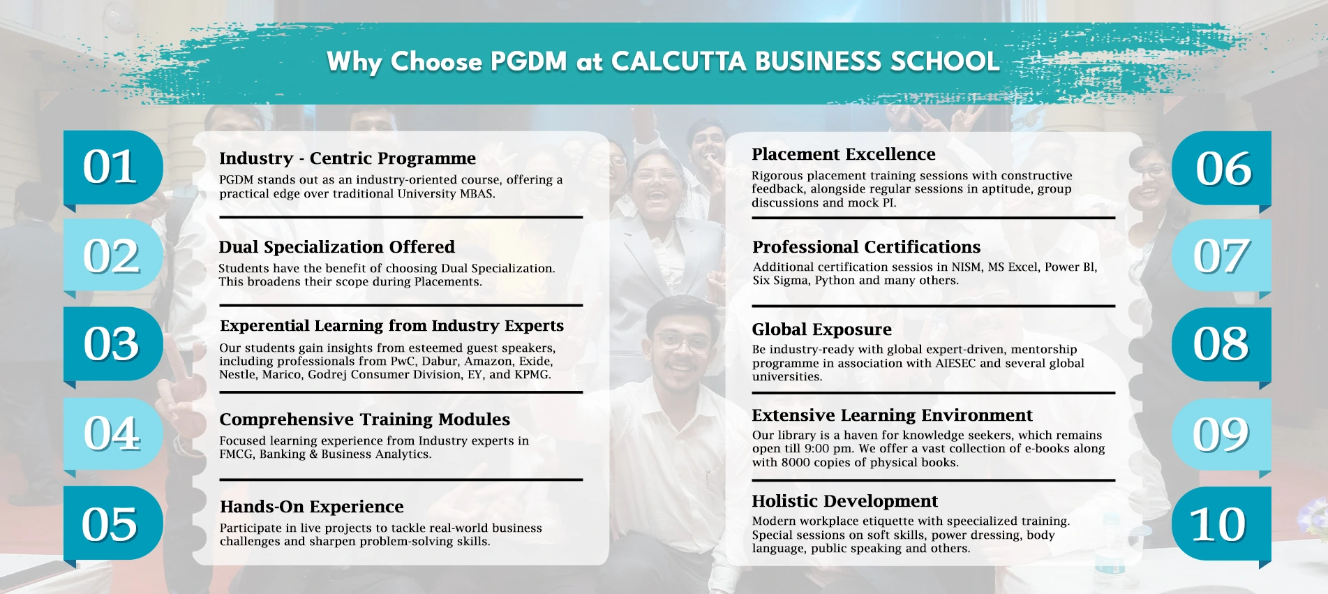 The AICTE-approved PGDM (Post Graduate Diploma in Management) program offered from CBS's campus in Bishnupur, near Kolkata, is a professional management course designed to equip students with advanced business skills and knowledge. Being approved by the All India Council for Technical Education (AICTE) ensures the program adheres to rigorous quality standards, providing students with industry-relevant education and opening doors to a variety of career opportunities.